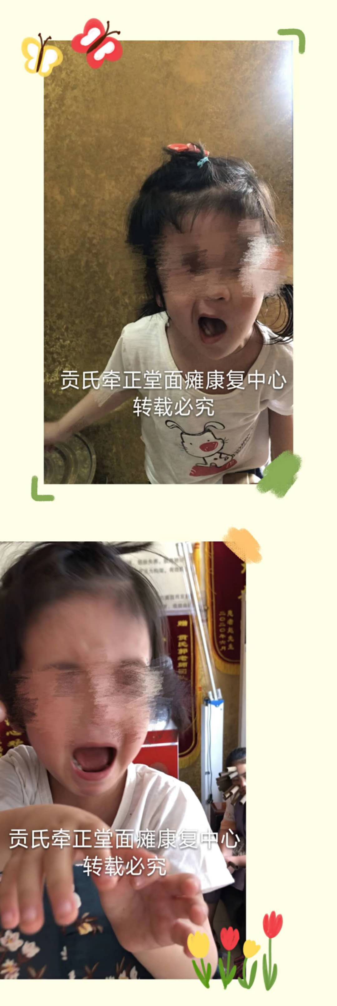 我家宝贝3岁了,孩子老说脸不舒服,我一看眼睛也睁不开了,一只眼睛变小了,眼睛不闭不上,嘴也有点歪斜,嘴角低,眉毛不动,赶紧带她去医院检查,医生说是面瘫,让孩子做针灸,因为孩子太小,针灸很疼,肯定会一直哭闹,也没舍得做,正好我姐是中医大夫,我就找她给看了看,她毕竟医疗界认识的人多,直接让我带孩子去贡氏牵正堂,经过两个疗程的康复疗法,宝贝嘴不歪了,眼也闭紧了,口型也正了,眉毛也抬起来了,明显的好转了,因为这里不打针不用药,医生说这是循经疗法,治愈率接近百分之百,我感到很幸运,谢谢郭老师的精心治疗,附带我孩子做治疗的照片一张,希望病友们都能早日康复,摆脱困扰