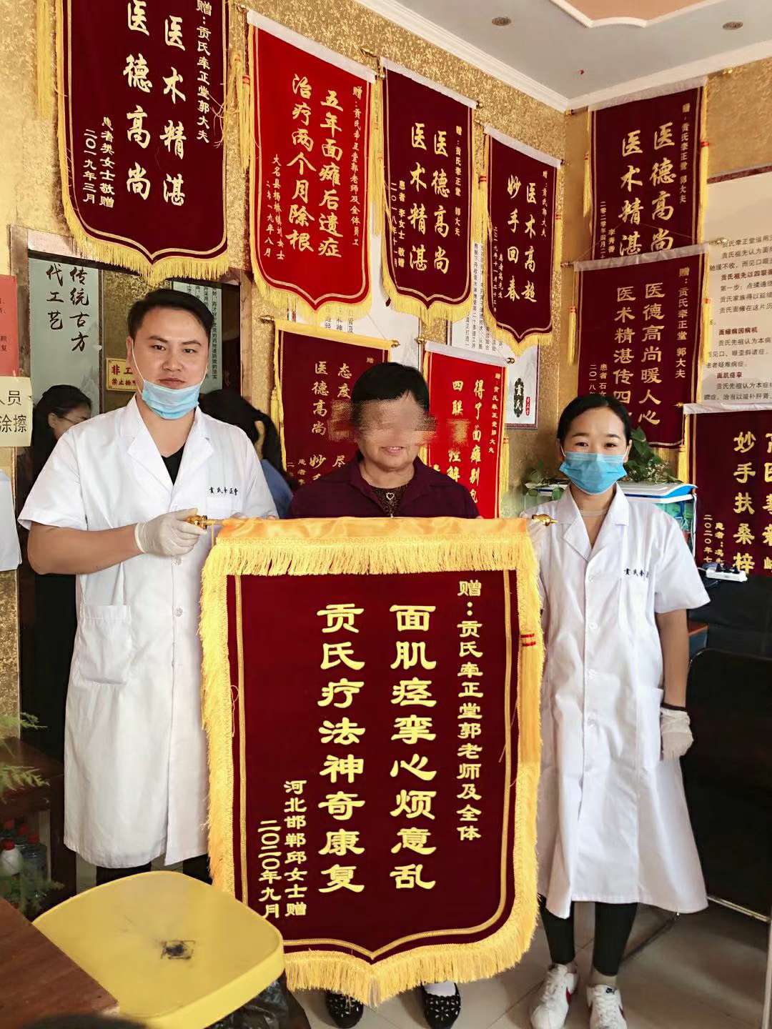 经阿姨同意后分享:邱阿姨大名人,在邯郸定居,面肌痉挛3年多,刚来时嘴跳、眼跳、抬眉不起、面肌颤动、嘴眼联动,一吃饭就闭眼睛,各种治疗方法都尝试过,始终没有治愈,都想去北京做手术了,因为年纪大了,不想来回跑,平常也不愿意出门,不和人交流,因此病情一只耽搁着,无意间孩子听说贡氏牵正堂每天的病号都特别多,就进去咨询了解后和邱阿姨商议,就直接过来了调理了,经过贡氏四联循经疗法一段时间的精心调理,面肌跳动现象基本不跳,抬眉闭眼等面部表情动作基本完善,已基本康复,阿姨非常高兴,四天只要来做一次理疗,阿姨都会亲自做好吃的给我们拿过来,看到阿姨恢复的这么好,我们也很开心,再后来又继续跟进了一段时间,阿姨症状全部消失,阿姨心里感激至极,今天特送锦旗一面,阿姨说只要我看到有脸跳动的,面瘫的都给他们说,让他们来咱贡氏牵正堂,让更多的人少走弯路,少遭罪,让他们更快的得到康复,感谢阿姨的信任!