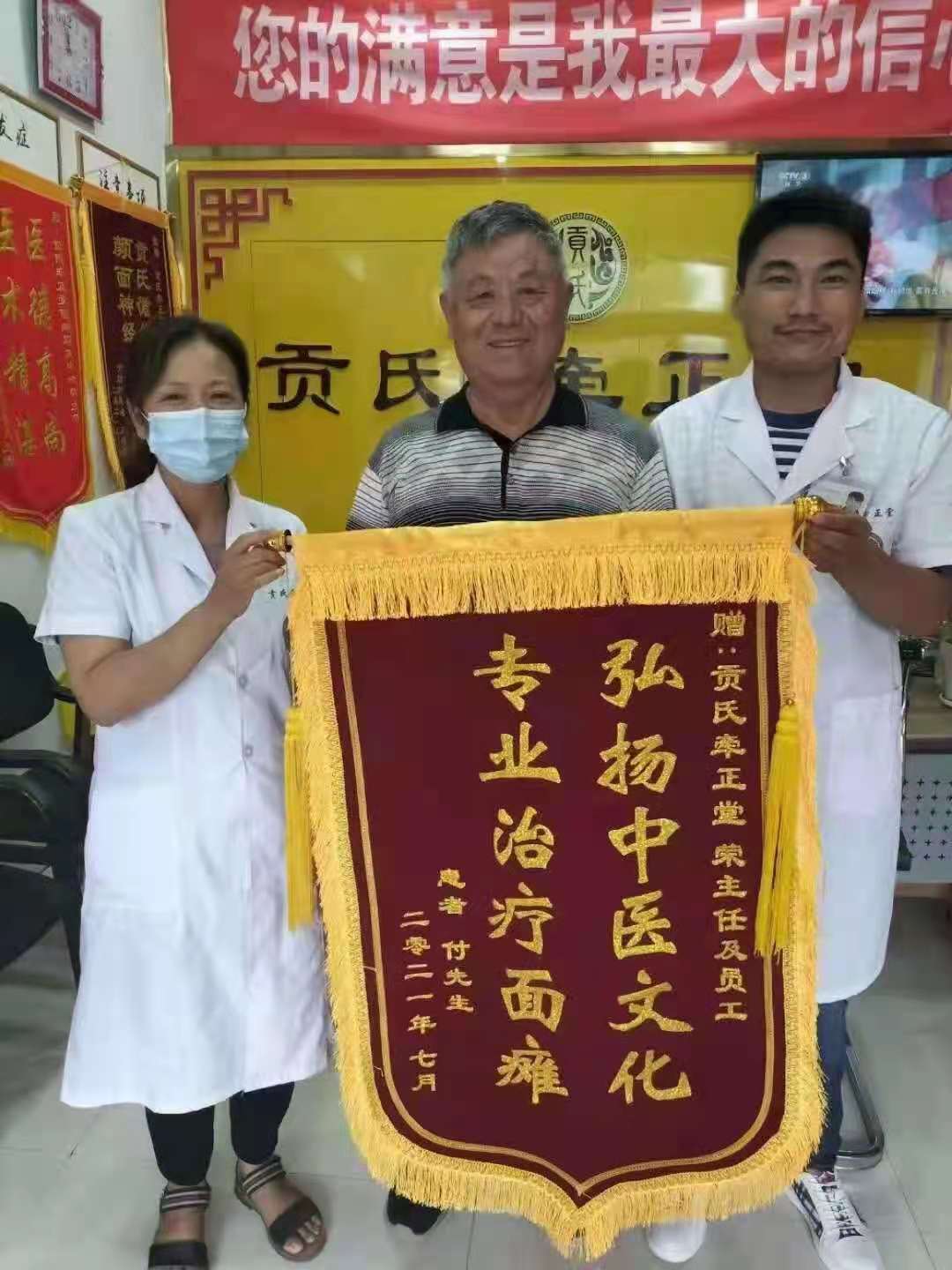 非常认可,直接就治疗上了,经过贡氏循经四联牵正疗法2个疗程已康复今天给我们送来了锦旗,非常感谢付老师的信任,祝付老师生活愉快,