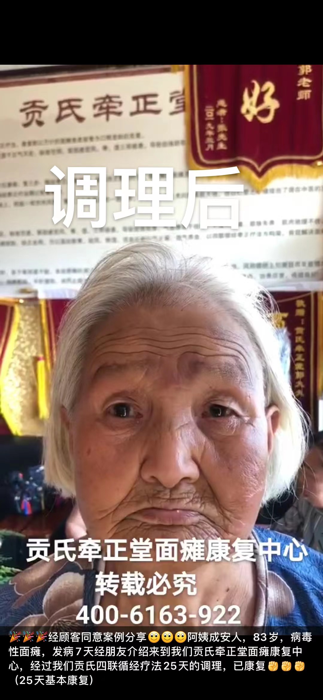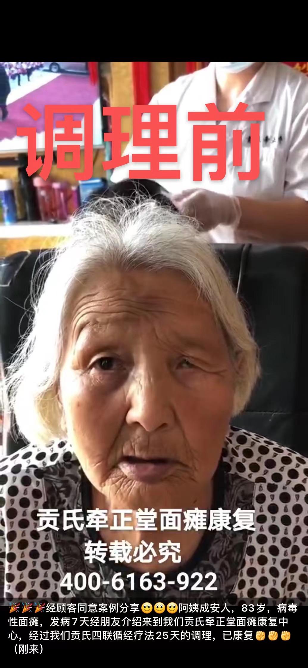 经顾客同意案例分享阿姨成安人,83岁,病毒性面瘫,发病7天经朋友介绍来到我们贡氏牵正堂面瘫康复中心,经过我们贡氏四联循经疗法25天的调理,已康复(25天基本康复)