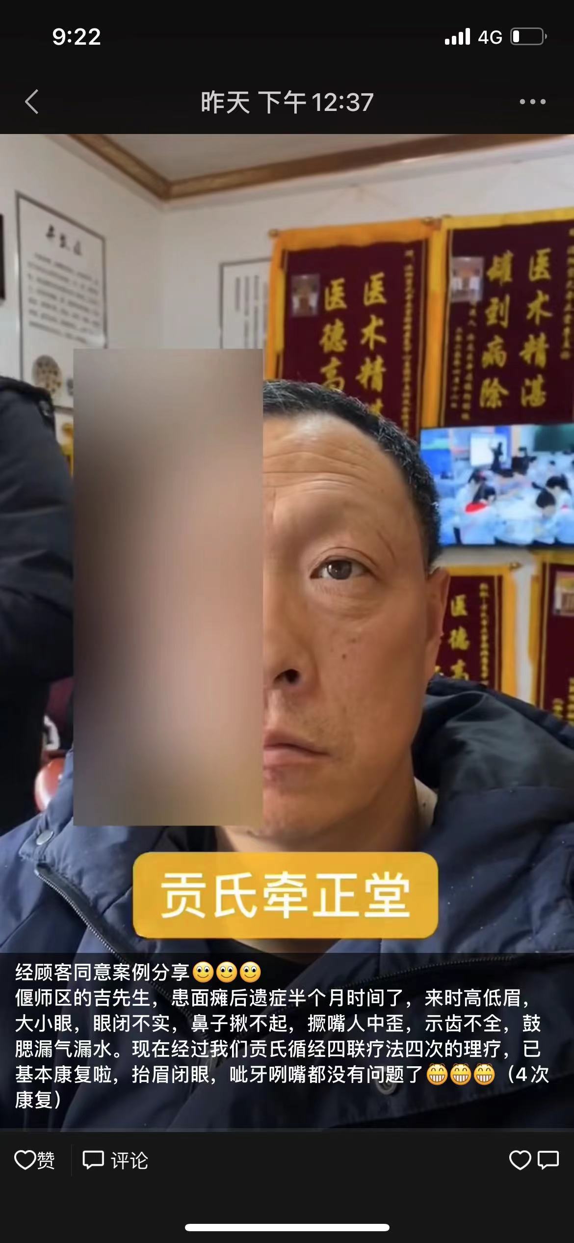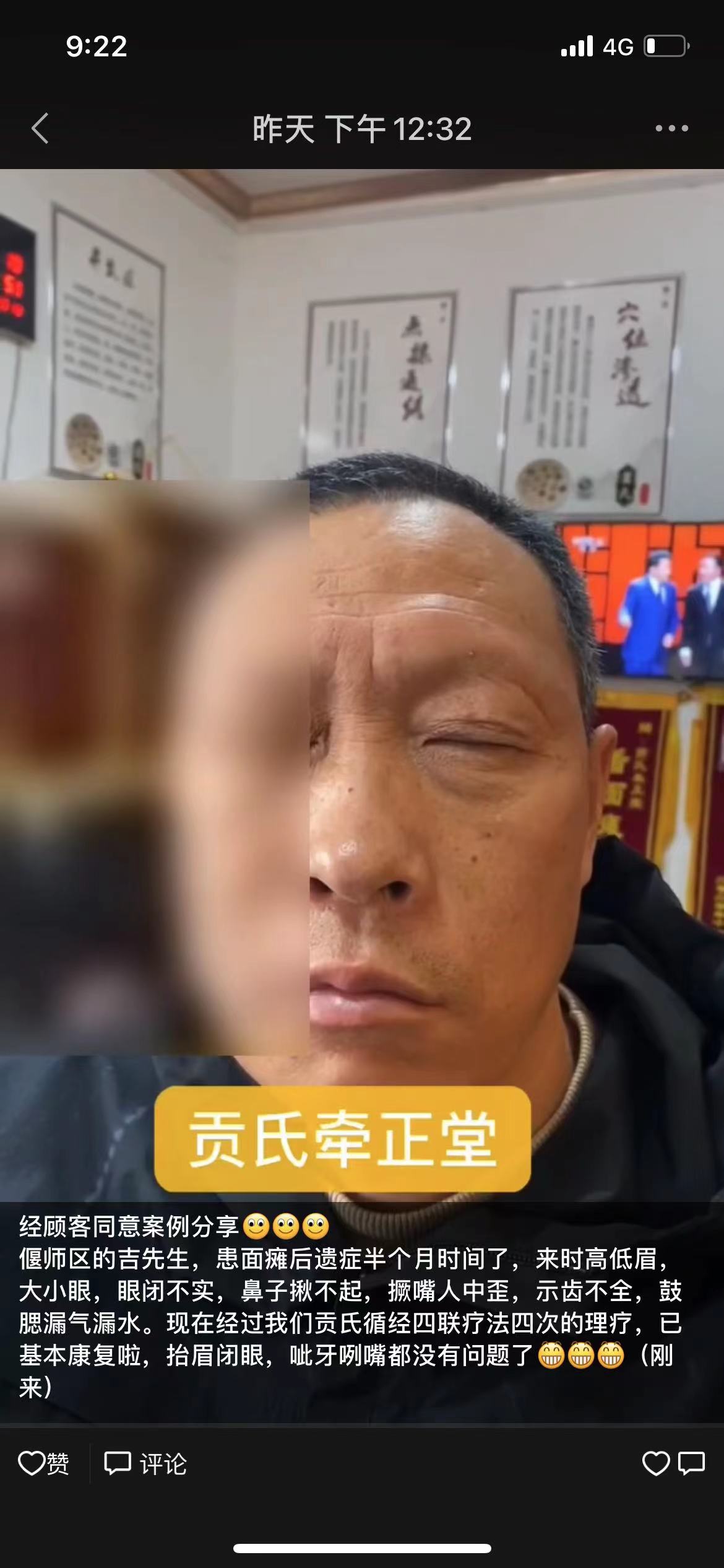 偃师区的吉先生,患面瘫后遗症半个月时间了,来时高低眉,大小眼,眼闭不实,鼻子揪不起,撅嘴人中歪,示齿不全,鼓腮漏气漏水。现在经过我们贡氏循经四联疗法四次的理疗,已基本康复啦,抬眉闭眼,呲牙咧嘴都没有问题了(4次康复)