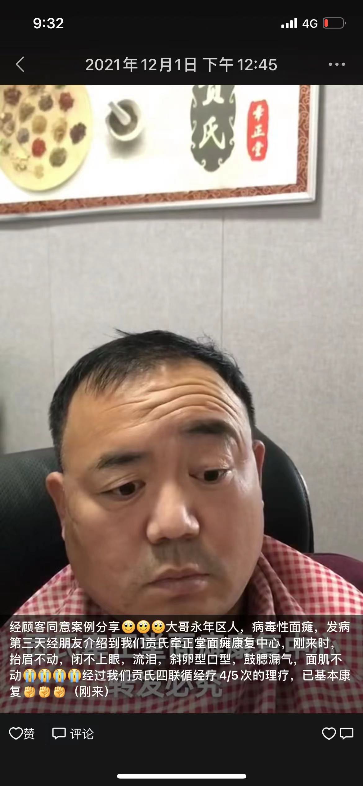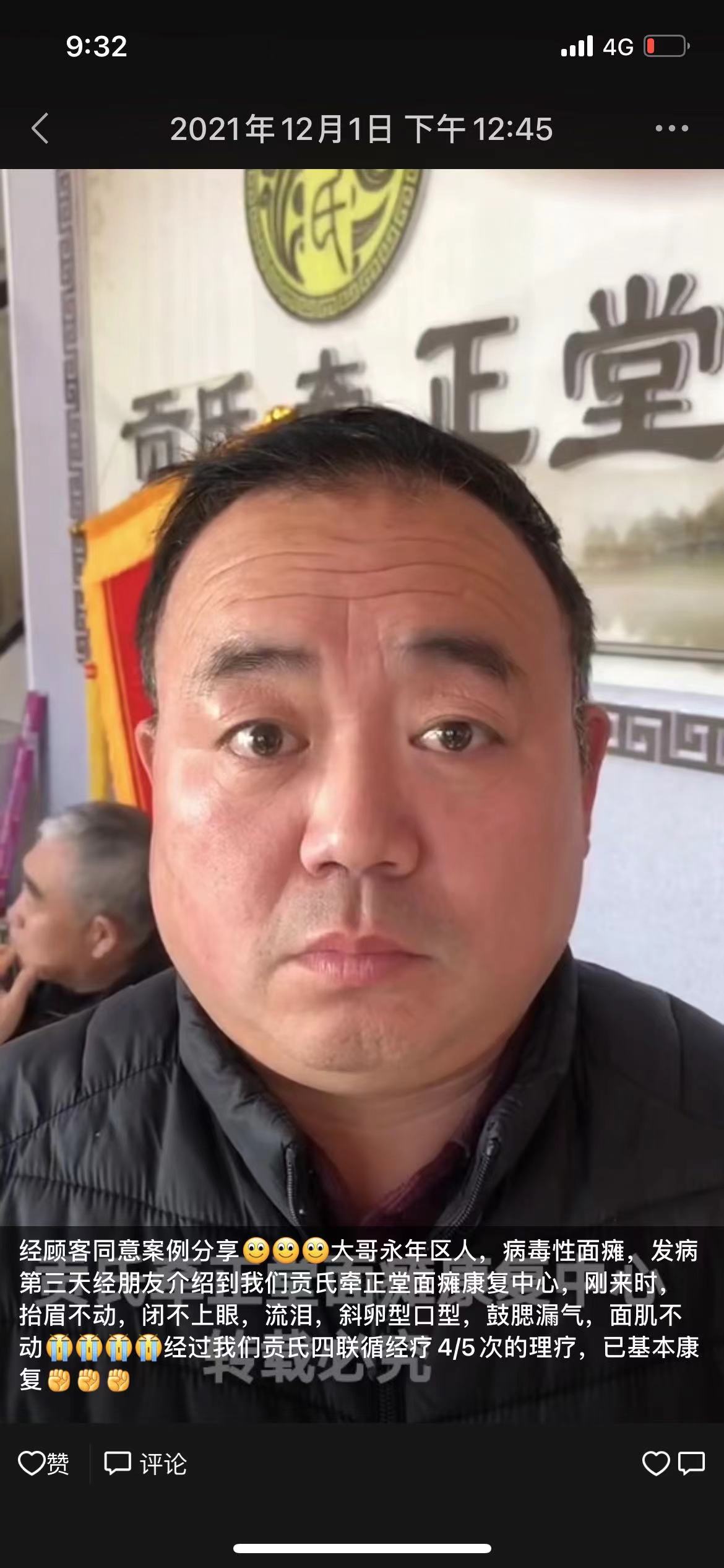 经顾客同意案例分享大哥永年区人,病毒性面瘫,发病第三天经朋友介绍到我们贡氏牵正堂面瘫康复中心,刚来时,抬眉不动,闭不上眼,流泪,斜卵型口型,鼓腮漏气,面肌不动经过我们贡氏四联循经疗4/5次的理疗,已基本康复