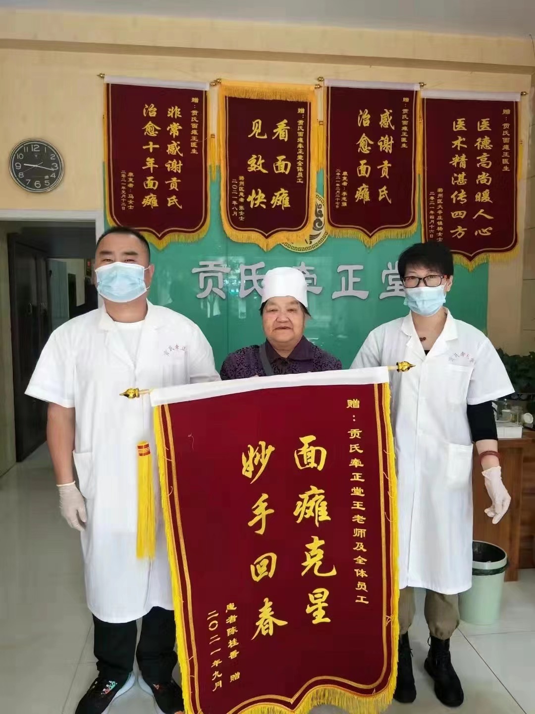 长治店陈阿姨面瘫三个月,来时眼肌无力,眼皮下垂,伴有流泪(鄂鱼泪症候群)患侧面部水肿,嘴歪眼斜,嘴角漏水,腮部留食物,鼻纹路消失。期间在医院针灸,喝中药,均无好转,后听朋友介绍来我贡氏面瘫康复中心,经我贡氏四联循经疗法三个疗程的精心调理,现已康复,阿姨非常高兴,今天特来送锦旗1面。谢谢阿姨的信任