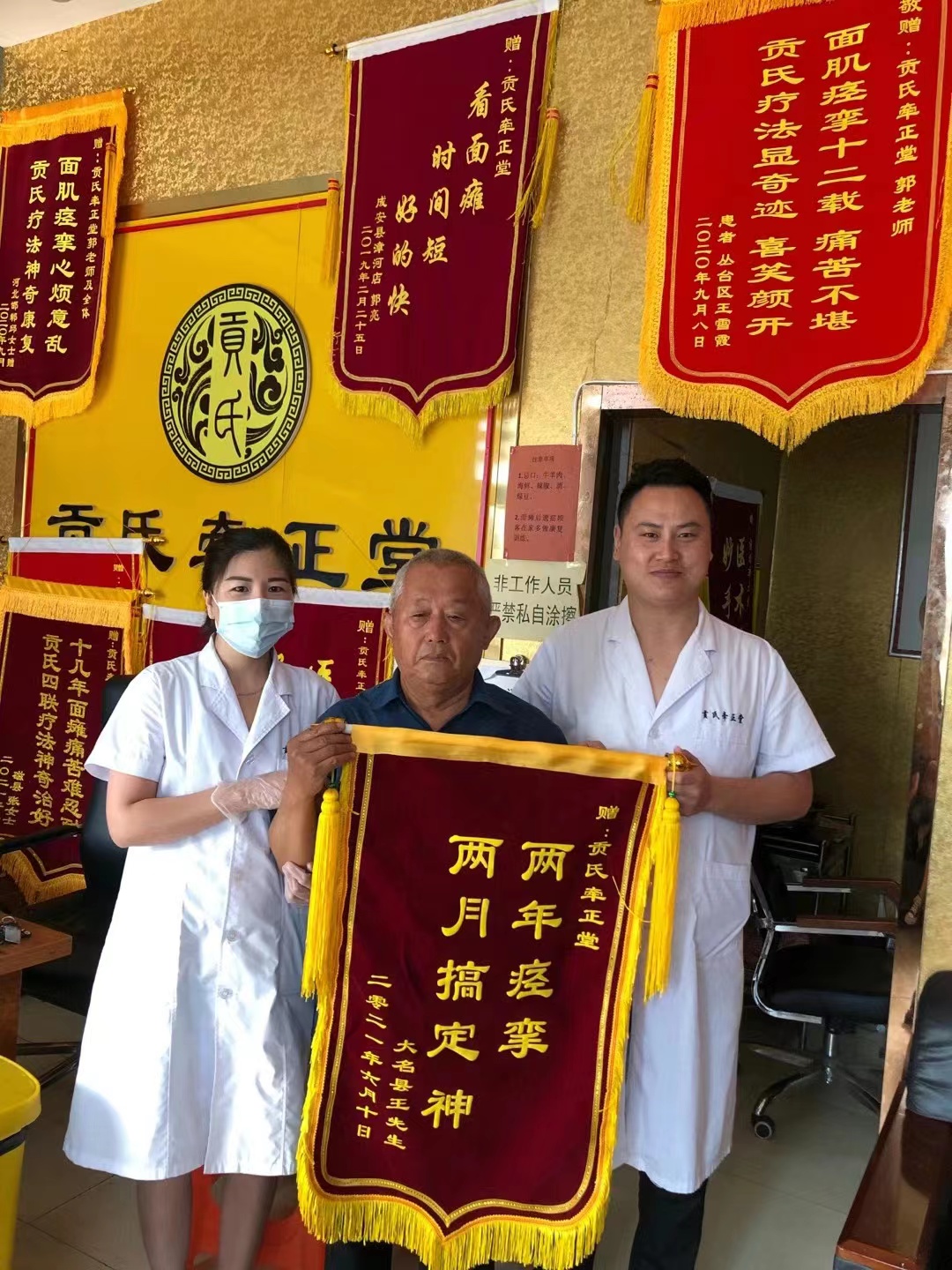 经顾客同意案例分享王叔叔大名人,面肌痉挛两年多(去年在我们店调理好的,1年多了没有复发今天送来锦旗1面)刚来治疗时嘴跳、眼跳、抬眉不起、面肌颤动、嘴眼联动,1吃饭就闭眼睛经过贡氏四联循经两个疗程左右的精心调理,嘴不抽了,眼不跳了,面部表情动作恢复正常,面肌痉挛已康复