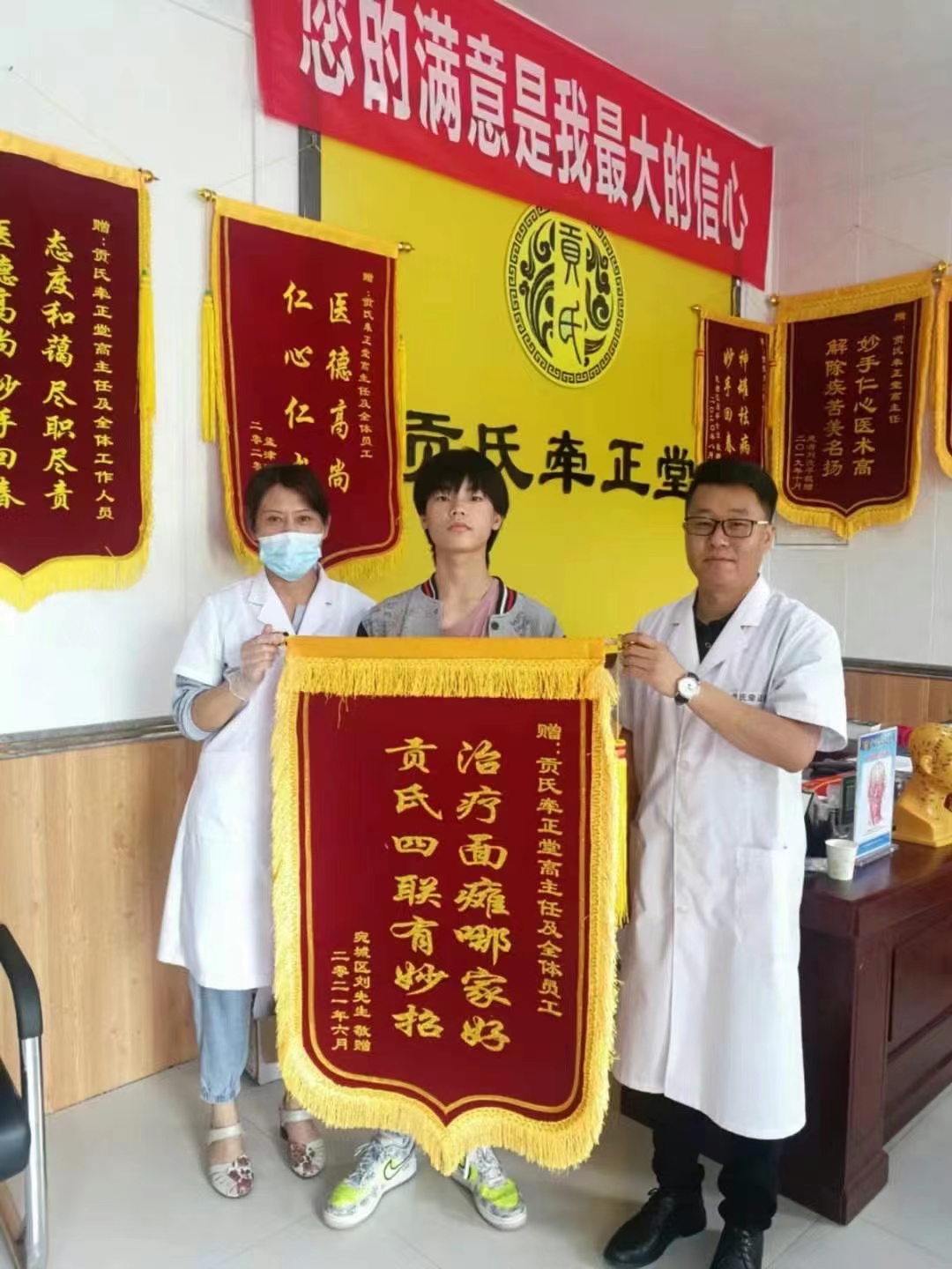 贡氏牵正堂南阳店住在宛城区的小帅哥16岁,病毒性面瘫,来时高低眉,撅嘴人中歪,耸鼻不动,鼓腮漏气,经过咱们贡氏循经四联牵正疗法1个疗程的治疗,现已完全康复孩子很高兴,父母也送来了锦旗,谢谢支持与信任,我们会更加努力,祝愿更多的顾客早日恢复健康美丽的容颜