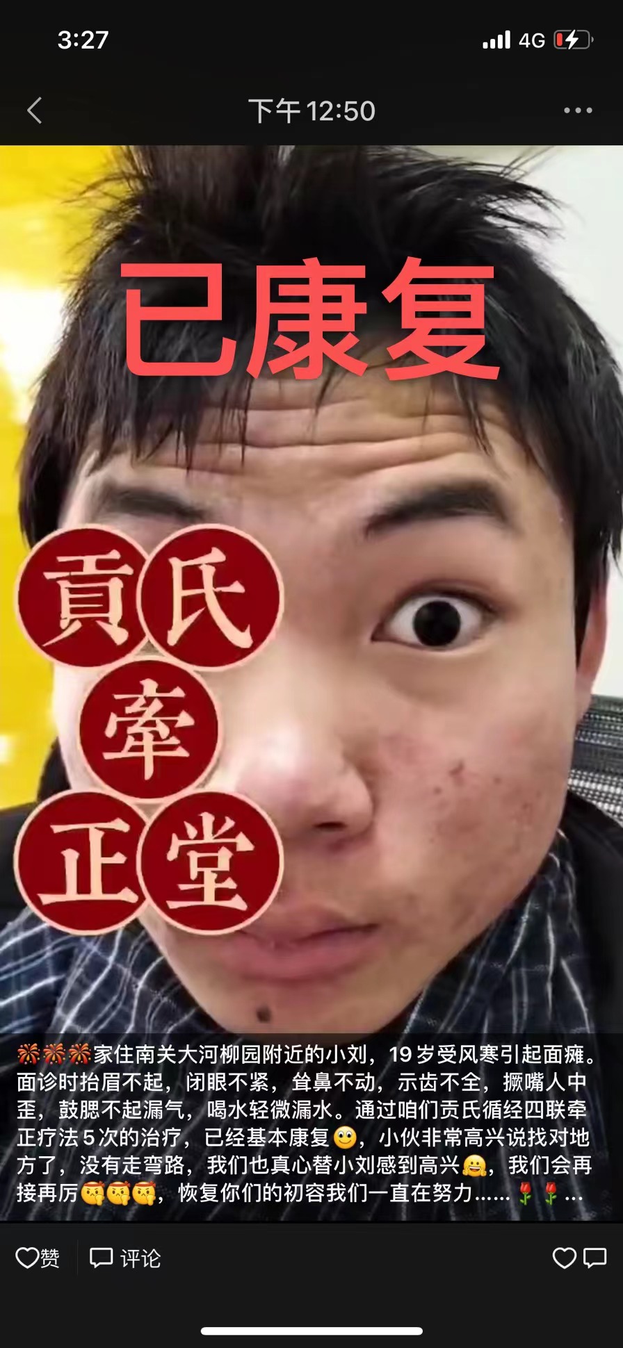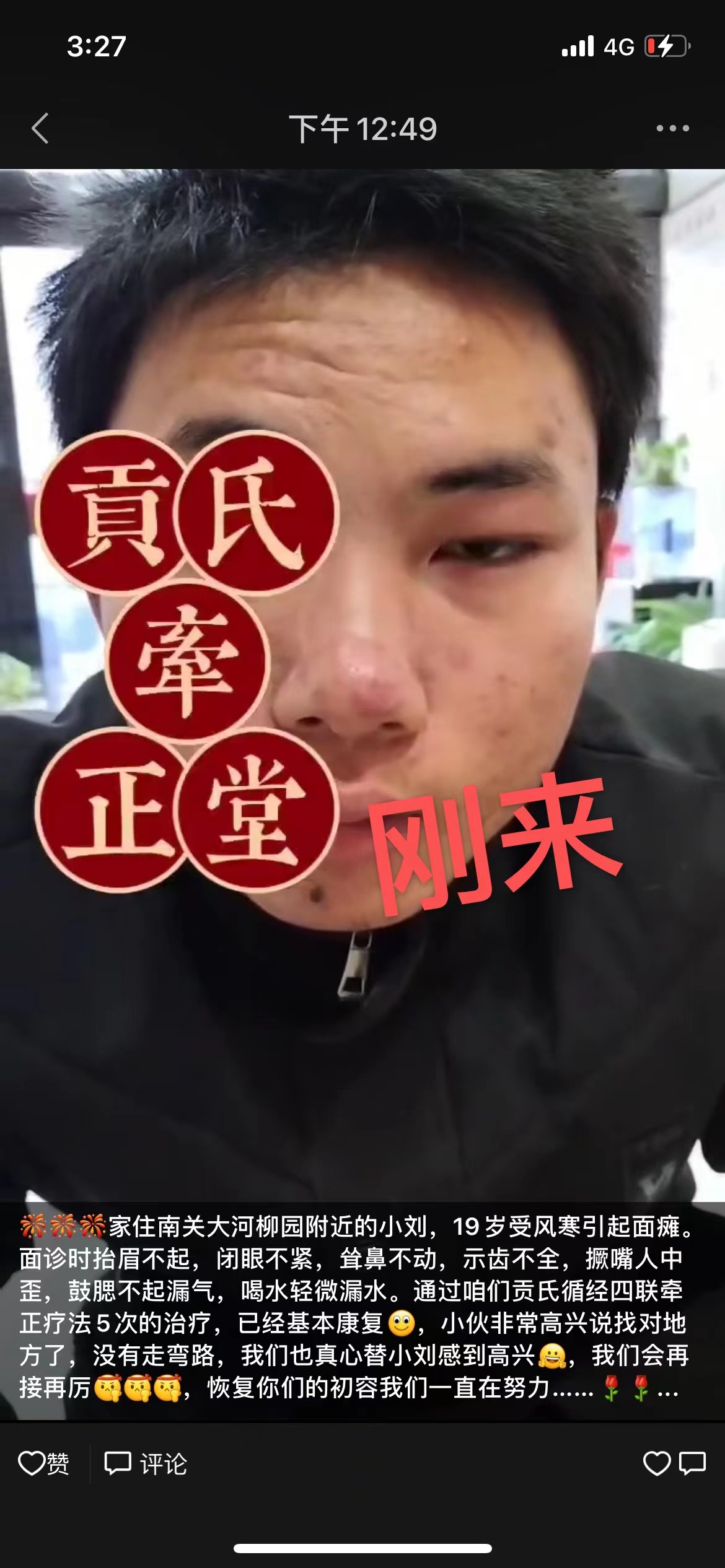 点击数:7322021-12-22 15:27:06 来源: 19岁受风寒引起面瘫,5次的理疗。已基本康复,贡氏牵正堂