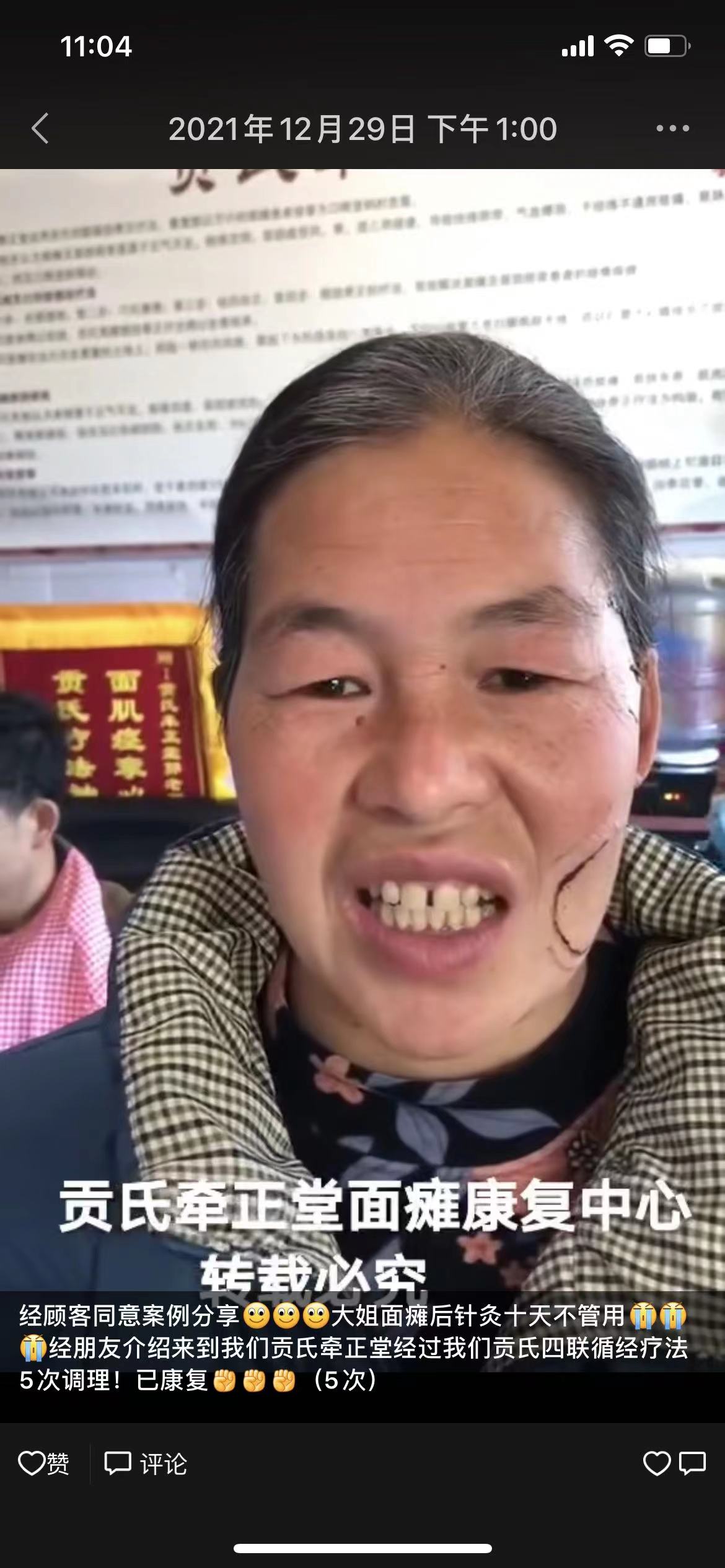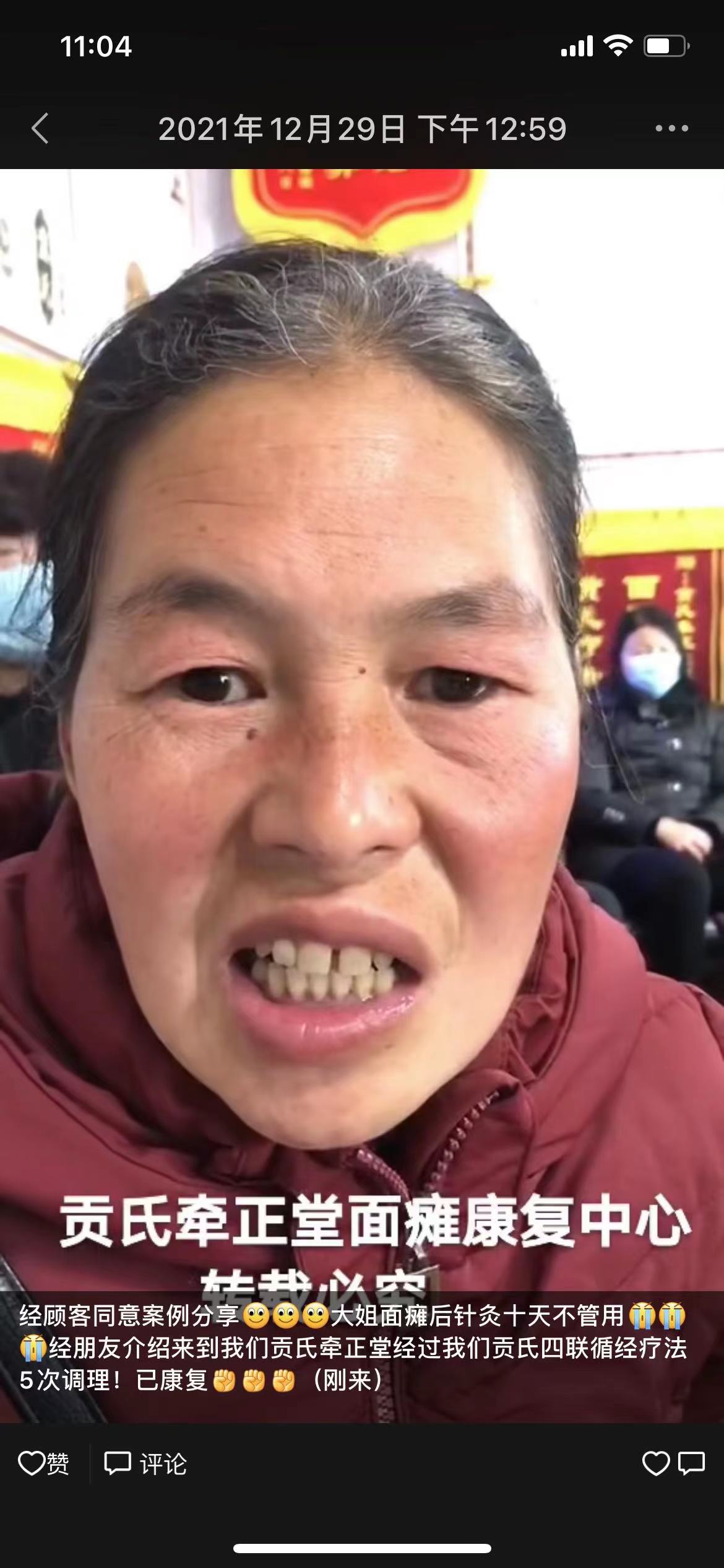 经顾客同意案例分享大姐面瘫后针灸十天不管用经朋友介绍来到我们贡氏牵正堂经过我们贡氏四联循经疗法5次调理!已康复(5次)