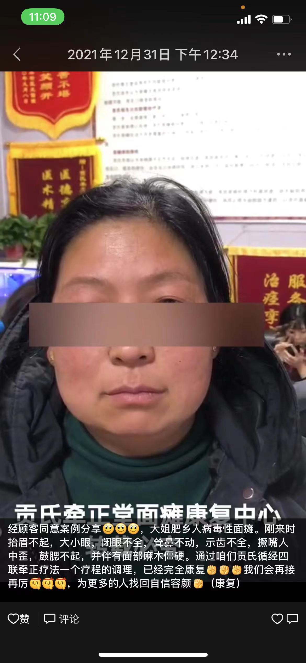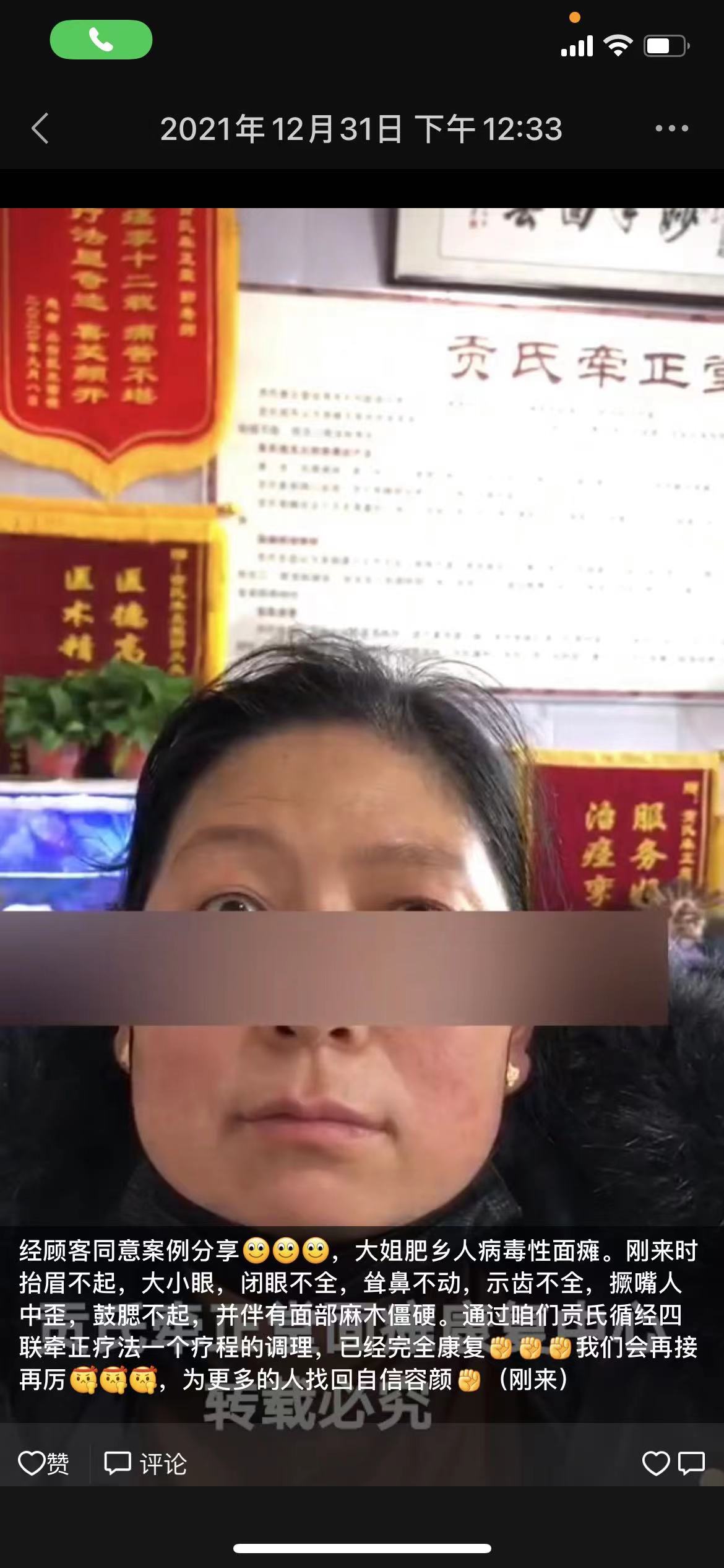 点击数:8452022-01-11 11:09:56 来源: 大姐病毒性面瘫,经过1个疗程的调理,已完全康复。贡氏牵正堂