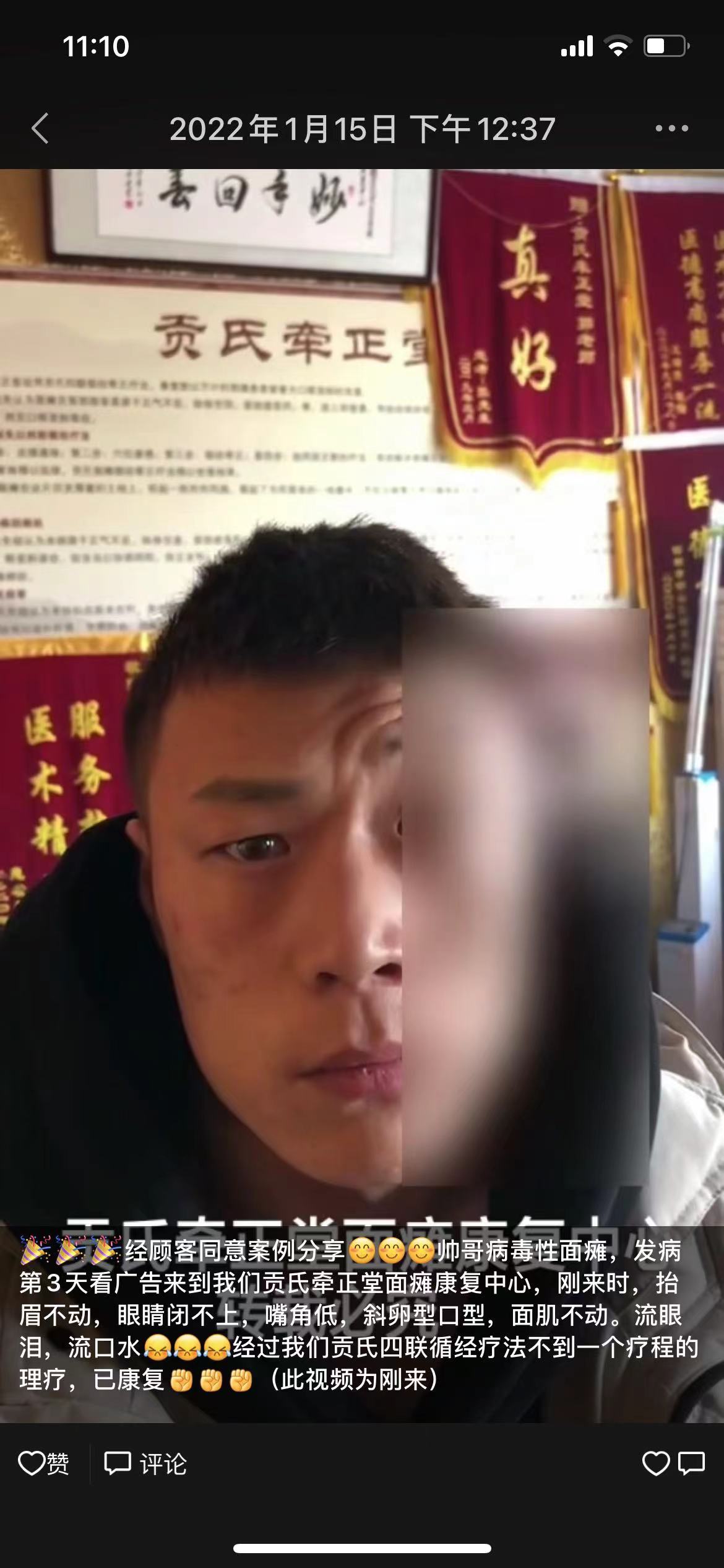 点击数:8302022-01-20 11:11:32 来源: 帅哥病毒性面瘫,不到1个疗程的理疗,已康复,贡氏牵正堂