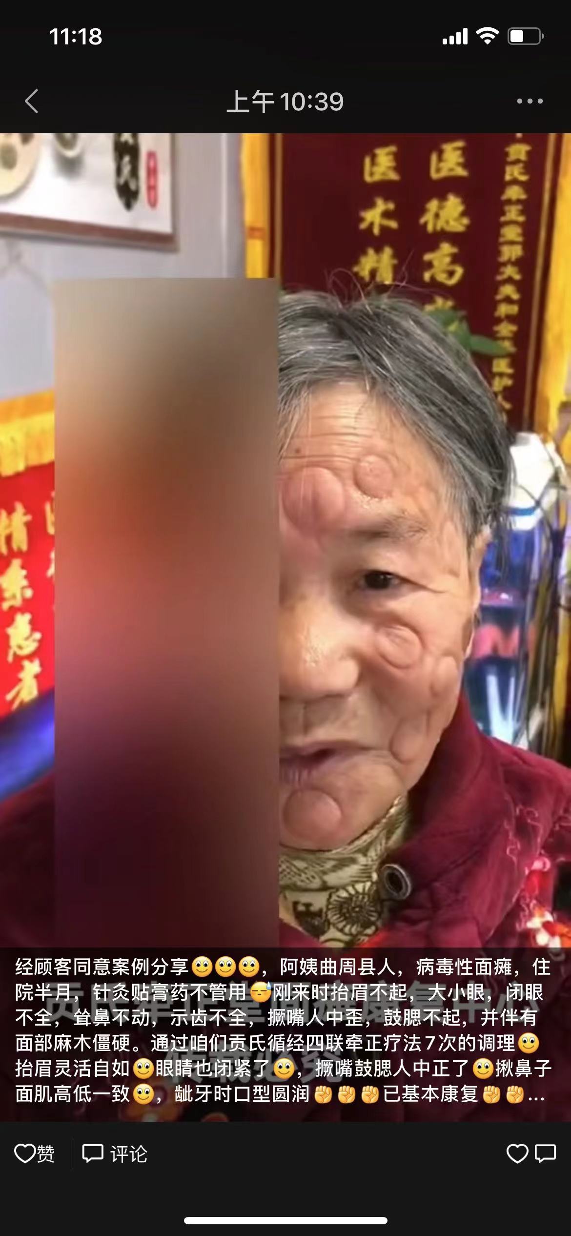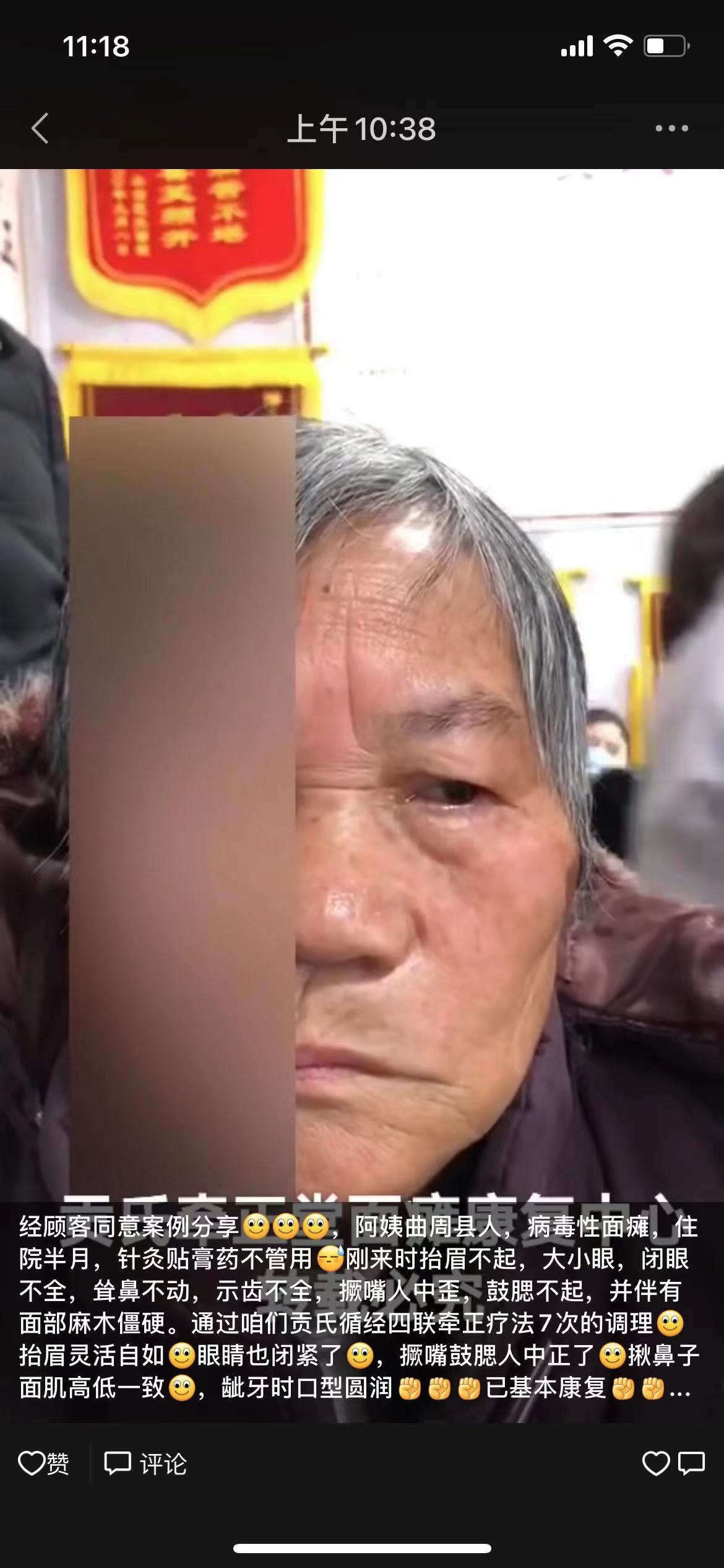 经顾客同意案例分享,阿姨曲周县人,病毒性面瘫,住院半月,针灸贴膏药不管用刚来时抬眉不起,大小眼,闭眼不全,耸鼻不动,示齿不全,撅嘴人中歪,鼓腮不起,并伴有面部麻木僵硬。通过咱们贡氏循经四联牵正疗法7次的调理抬眉灵活自如眼睛也闭紧了,撅嘴鼓腮人中正了揪鼻子面肌高低1致,龇牙时口型圆润已基本康复(康复)