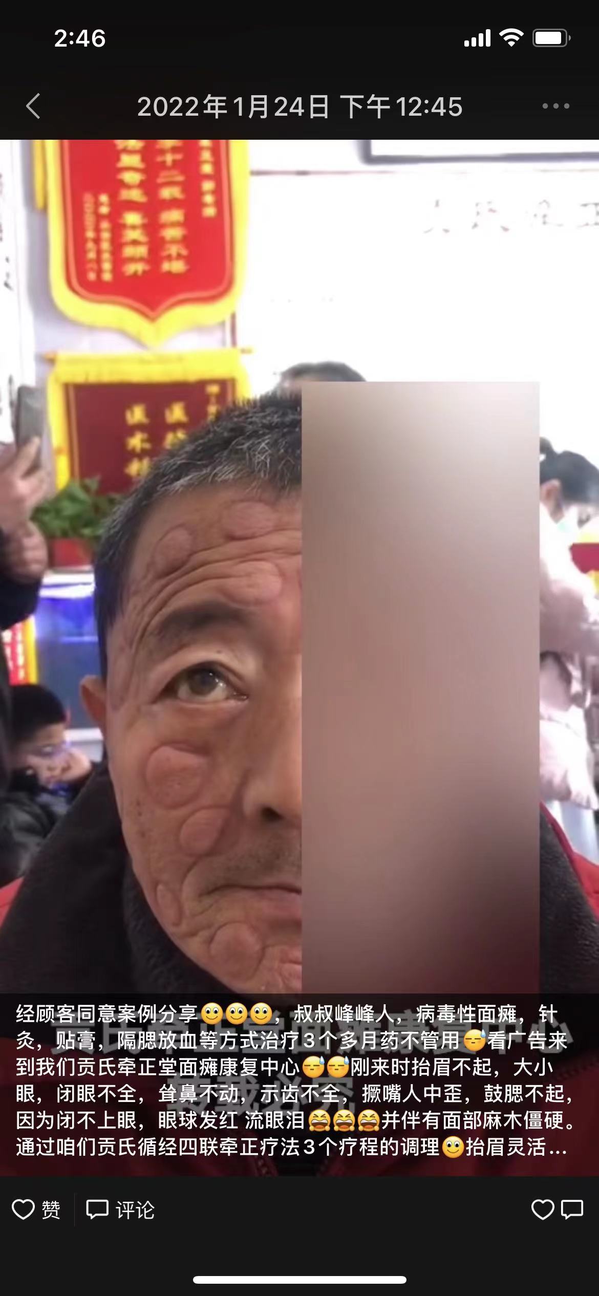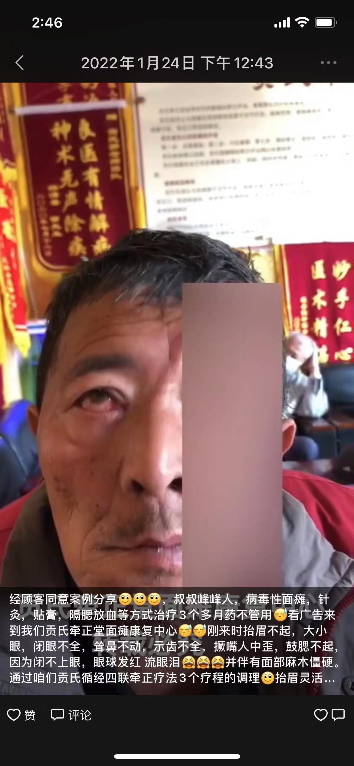 点击数:10012022-02-09 14:47:07 来源: 叔叔病毒性面瘫,经过3个疗程的调理基本上快好了,贡氏牵正堂
