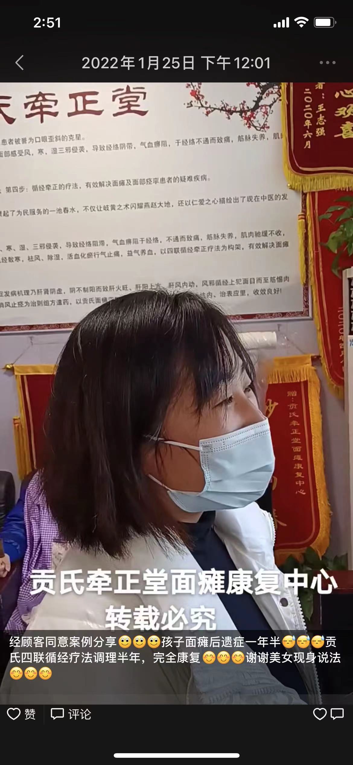 点击数:8042022-02-09 14:51:43 来源: 经顾客同意案例分享孩子面瘫后遗症一年半贡氏四联循经疗法调理半年,完全康复,贡氏牵正堂