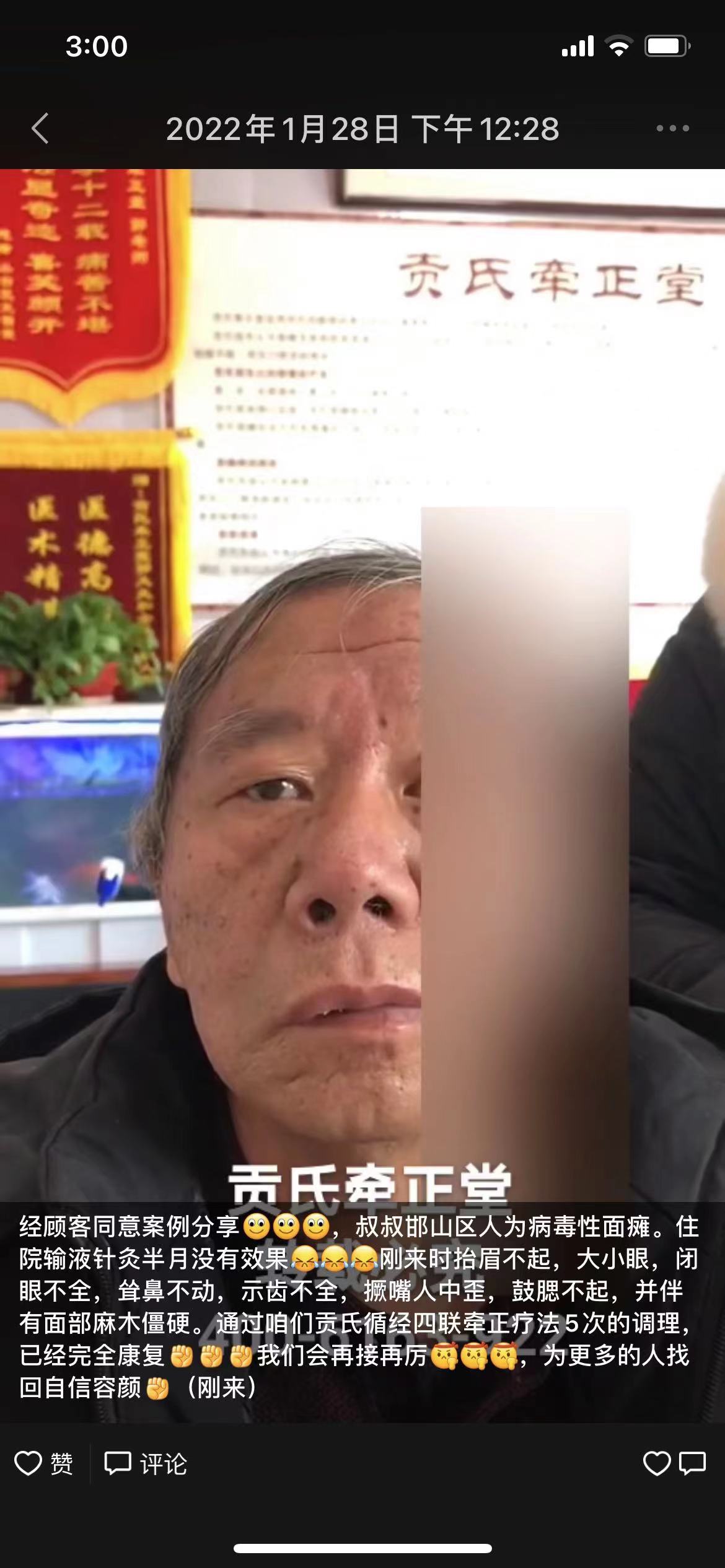 点击数:8862022-02-09 15:02:07 来源: 叔叔病毒性面瘫,5次基本上已恢复,贡氏牵正堂