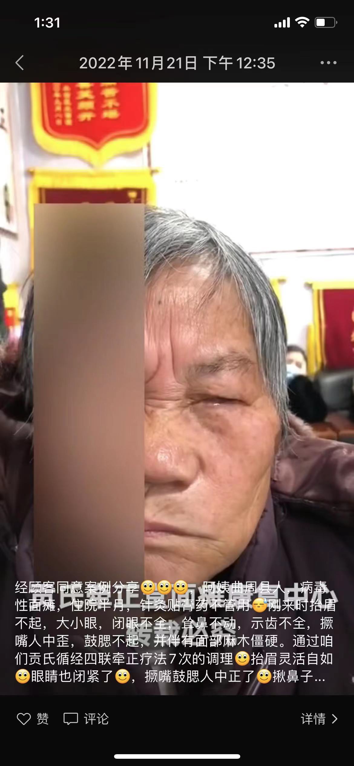 点击数:5712022-12-05 13:41:16 来源: 阿姨曲周县人,病毒性面瘫,住院半月,针灸贴膏药不管用,通过咱们贡氏循经四联牵正疗法7次的调理已基本康复,贡氏牵正堂