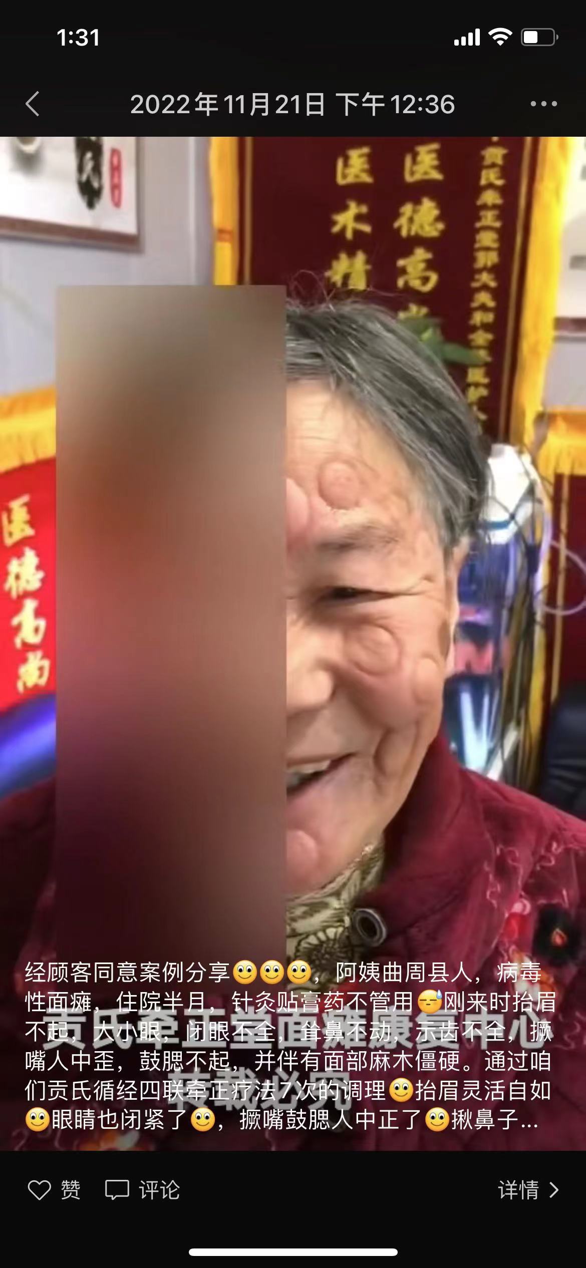 经顾客同意案例分享,阿姨曲周县人,病毒性面瘫,住院半月,针灸贴膏药不管用刚来时抬眉不起,大小眼,闭眼不全,耸鼻不动,示齿不全,撅嘴人中歪,鼓腮不起,并伴有面部麻木僵硬。通过咱们贡氏循经四联牵正疗法7次的调理抬眉灵活自如眼睛也闭紧了,撅嘴鼓腮人中正了揪鼻子面肌高低1致,龇牙时口型圆润已基本康复(基本康复)